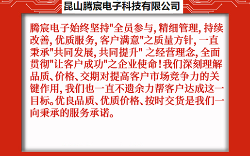 昆山騰宸電子科技有限公司位于中國線路板加工之都昆山千燈,公司專注于電路板研發(fā)設(shè)計(jì)、PCB抄板、元器件采購、SMT貼片加工、組裝測試,為客戶提供一站式電子制造服務(wù)。騰宸電子始終堅(jiān)持"全員參與,精細(xì)管理,持續(xù)改善,優(yōu)質(zhì)服務(wù),客戶滿意"之質(zhì)量方針,一直秉承"共同發(fā)展,共同提升" 之經(jīng)營理念,全面貫徹"讓客戶成功"之企業(yè)使命!我們深刻理解品質(zhì)、價(jià)格、交期對(duì)提高客戶市場競爭力的關(guān)鍵作用,我們也一直不遺余力幫客戶達(dá)成這一目標(biāo)。優(yōu)良品質(zhì)、優(yōu)質(zhì)價(jià)格、按時(shí)交貨是我們一向秉承的服務(wù)承諾。 ...
